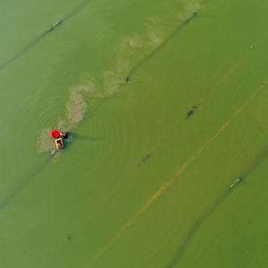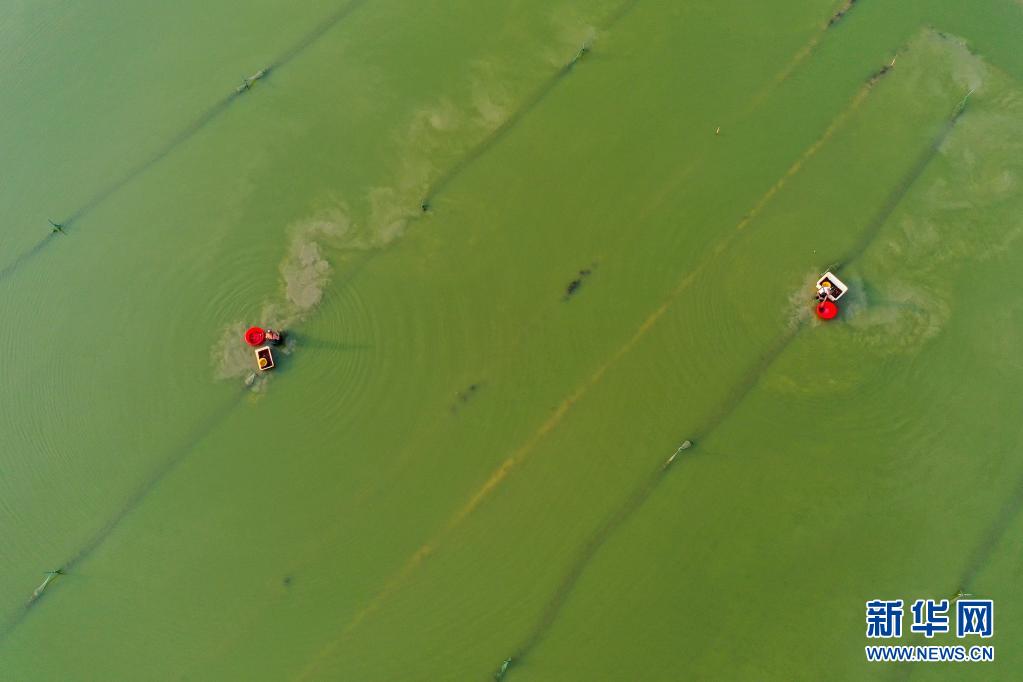 7月5日,在湖南省永州市道縣蚣?jí)捂?zhèn)洲背村,村民在收獲小龍蝦(無人機(jī)照片)。