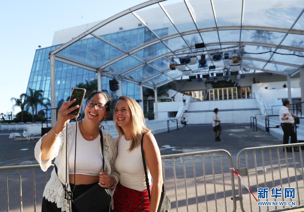 7月5日,人們?cè)诜▏?guó)戛納的電影宮外拍照留念。