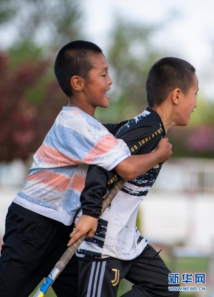 塔城市第二小學(xué)曲棍球隊(duì)的小隊(duì)員申世豪(左)和隊(duì)友哈爾肯·夏里甫歡呼慶祝訓(xùn)練賽中的進(jìn)球(6月11日攝)。