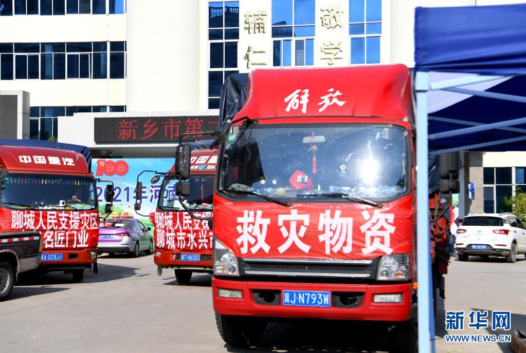 這是7月25日在河南省新鄉(xiāng)市第二中學(xué)安置點拍攝的物資運輸車輛。