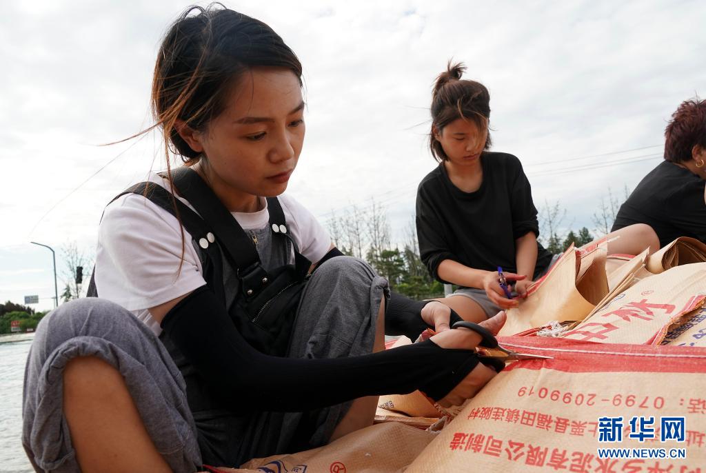 當日,在河南省鶴壁市??h傅莊堤上,不少群眾自發(fā)前來和救援人員一起裝沙袋、運沙袋,共筑堤壩。受持續(xù)強降雨影響,??h防汛形勢嚴峻,傅莊堤主要為??h縣城及26個村莊提供保護。新華社記者 李安 攝