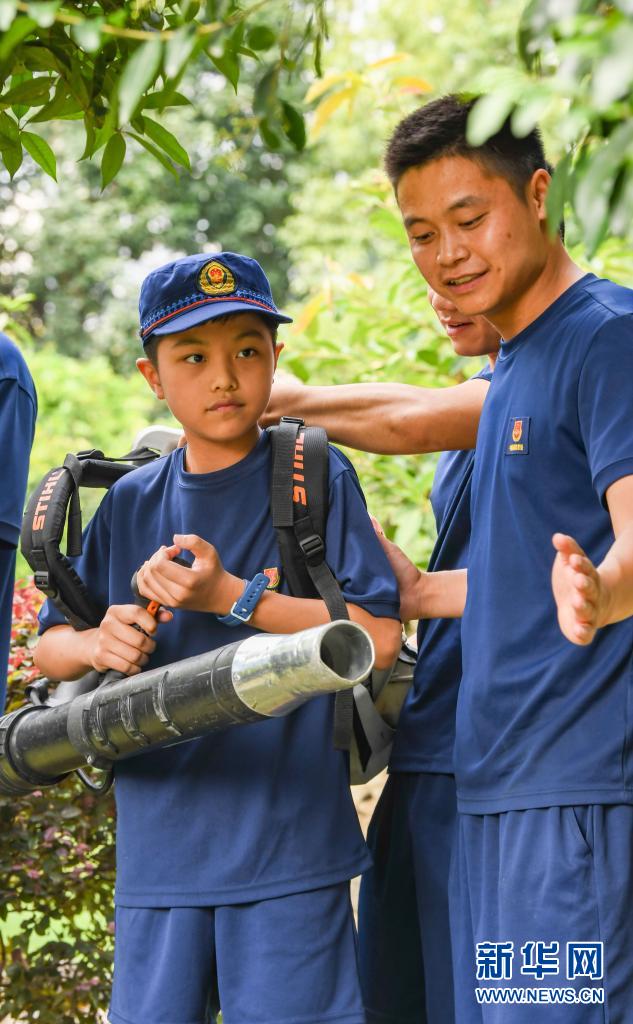 在四川省森林消防總隊特勤大隊,消防員王波平帶著一名孩子在體驗風(fēng)力滅火機(7月27日攝)。