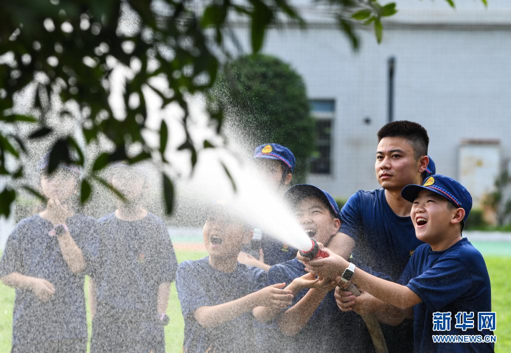 在四川省森林消防總隊特勤大隊,消防員劉淘宇(右二)帶著孩子們體驗水泵滅火操作(7月27日攝)。