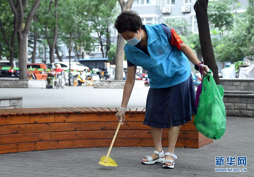 8月14日,在北京市海淀區(qū)薊門里社區(qū),董星梅撿拾落葉。