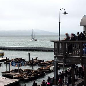 8月15日,人們?cè)诿绹f金山海邊觀看海獅。