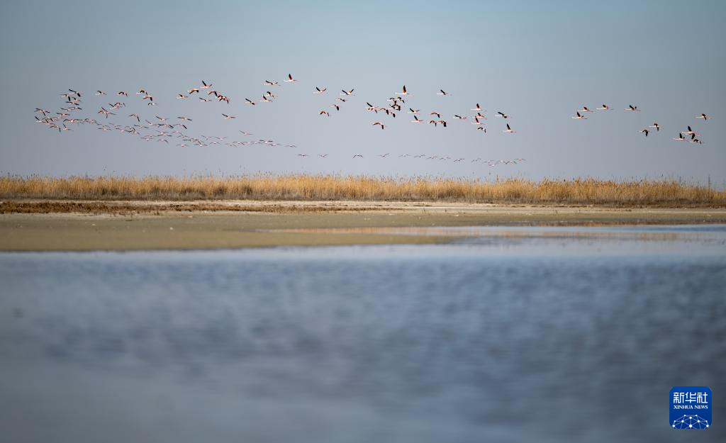 3月10日,在哈萨克斯坦曼格斯套州阿克套市郊,火烈鸟在卡拉科尔湖飞翔。