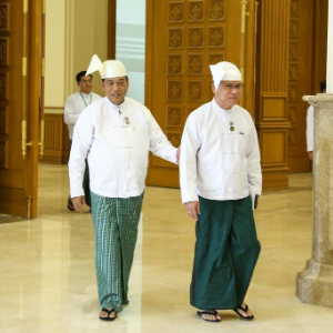 3月16日,在缅甸首都内比都,联邦巩固与发展党(巩发党)主席钦益(左)出席第三届人民院第一次会议。