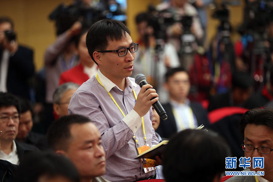10月21日,十九大新聞中心舉辦記者招待會(huì),邀請(qǐng)國(guó)家發(fā)展改革委黨組書(shū)記、主任何立峰,副主任張勇,副主任寧吉喆介紹以新發(fā)展理念為引領(lǐng),推進(jìn)中國(guó)經(jīng)濟(jì)平穩(wěn)健康可持續(xù)發(fā)展有關(guān)情況,并回答記者提問(wèn)。圖為經(jīng)濟(jì)日?qǐng)?bào)記者提問(wèn)。新華網(wǎng) 郝廣鵬攝