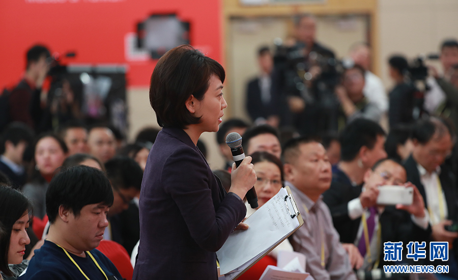 10月26日上午10:00,中國共產(chǎn)黨第十九次全國代表大會新聞發(fā)言人在梅地亞賓館二層新聞發(fā)布廳召開專題新聞發(fā)布會,請有關(guān)方面負(fù)責(zé)人解讀十九大報(bào)告,并回答記者關(guān)心的問題。圖為中央電視臺記者提問。新華網(wǎng) 翟子赫 攝