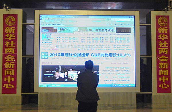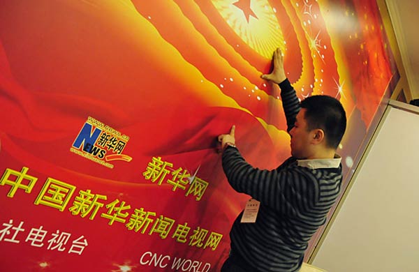 3月1日,新華網(wǎng)兩會(huì)報(bào)道人員正在布置工作間。第十一屆全國人民代表大會(huì)第四次會(huì)議、全國政協(xié)十一屆四次會(huì)議即將開幕。