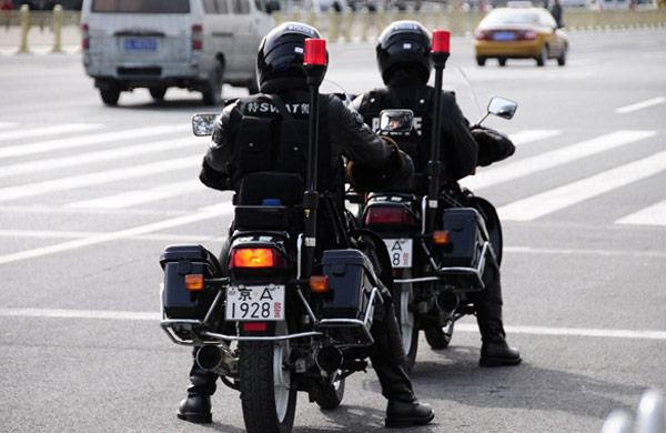 3月1日,特警隊(duì)員在人民大會(huì)堂東門外巡邏。十一屆全國人大第四次會(huì)議、全國政協(xié)十一屆四次會(huì)議即將開幕。