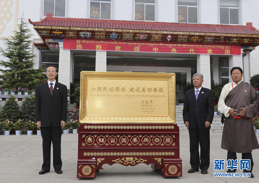 ??? 9月9日至10日,中央書記處書記、全國政協(xié)副主席、中央代表團副團長杜青林率林芝分團,帶著以習近平同志為總書記的黨中央對西藏各族人民的深切關懷和全國人民的美好祝福,看望慰問當?shù)馗髯甯刹咳罕?。這是9月10日,杜青林向林芝市贈送習近平總書記題詞“加強民族團結(jié) 建設美麗西藏”賀匾。 新華社記者丁林攝