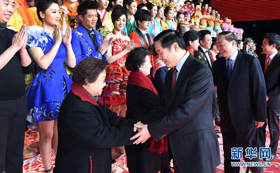 ??? 2月5日,中共中央政治局委員、中央書(shū)記處書(shū)記、中宣部部長(zhǎng)劉奇葆在北京中央電視臺(tái)春節(jié)聯(lián)歡晚會(huì)彩排現(xiàn)場(chǎng),親切看望正在緊張工作的演職人員。新華社記者 張鐸 攝