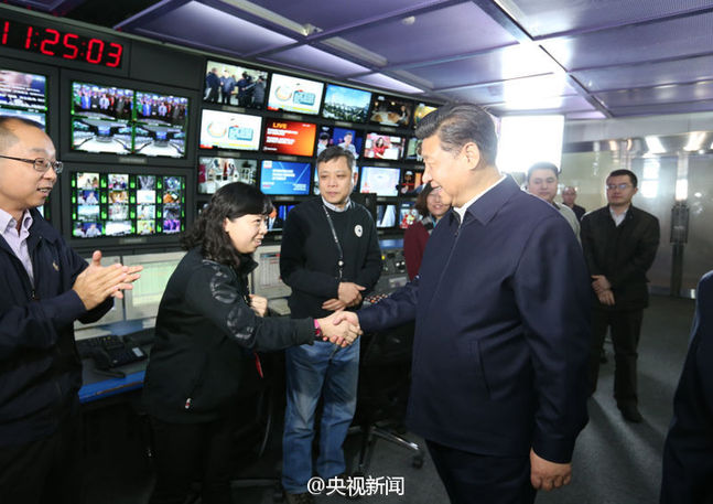 在總控中心,他同位于華盛頓市中心的北美分臺(tái)視頻連線(xiàn),了解了分臺(tái)建設(shè)運(yùn)行情況。之后,習(xí)近平來(lái)到中央電視臺(tái)《新聞聯(lián)播》演播室、導(dǎo)播間,同編播團(tuán)隊(duì)互動(dòng)交流。