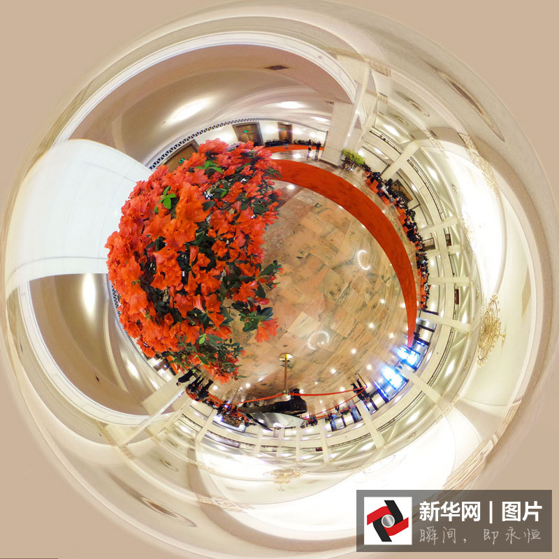 ??? 兩會期間,人民大會堂里溫暖如春,杜鵑花、迎春花等春花競相開放,記者用360度球形全景的特殊視角展現(xiàn)人民大會堂里春花開放的美景。圖片來源:視覺中國