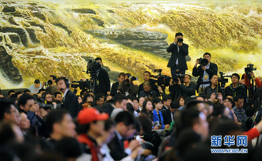 3月16日上午,國(guó)務(wù)院總理李克強(qiáng)在人民大會(huì)堂三樓金色大廳會(huì)見采訪十二屆全國(guó)人大四次會(huì)議的中外記者并回答記者提出的問題。圖為記者會(huì)現(xiàn)場(chǎng)。新華網(wǎng)/中國(guó)政府網(wǎng) 陳競(jìng)超 攝