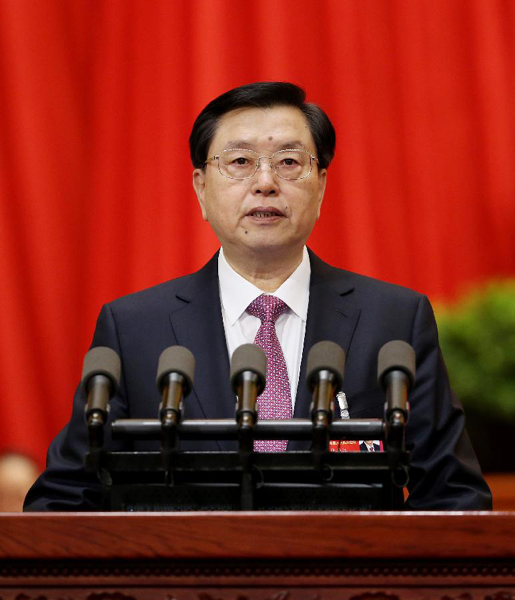 3月9日,十二屆全國人大常委會委員長張德江受十二屆全國人大常委會委托,向十二屆全國人大四次會議作《全國人民代表大會常務委員會工作報告》。新華社記者 姚大偉 攝