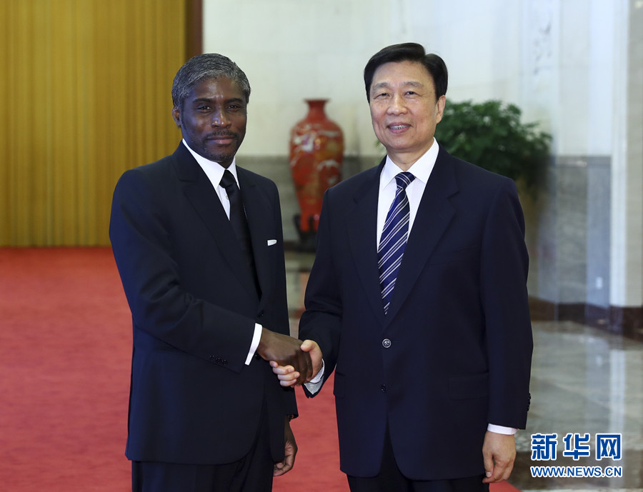 7月13日,中國國家副主席李源潮在北京人民大會堂與赤道幾內亞副總統(tǒng)曼格會談。 新華社記者 謝環(huán)馳 攝