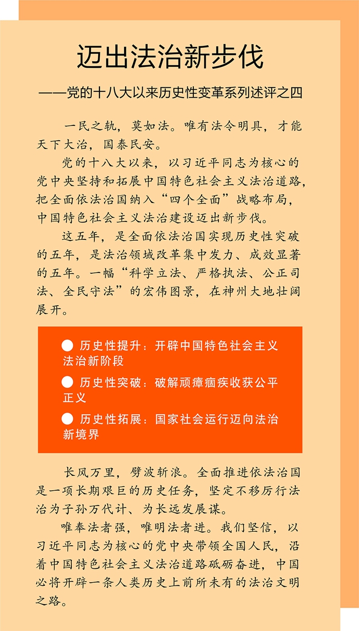 這五年,是全面依法治國實(shí)現(xiàn)歷史性突破的五年,是法治領(lǐng)域改革集中發(fā)力、成效顯著的五年。一幅“科學(xué)立法、嚴(yán)格執(zhí)法、公正司法、全民守法”的宏偉圖景,在神州大地壯闊展開。