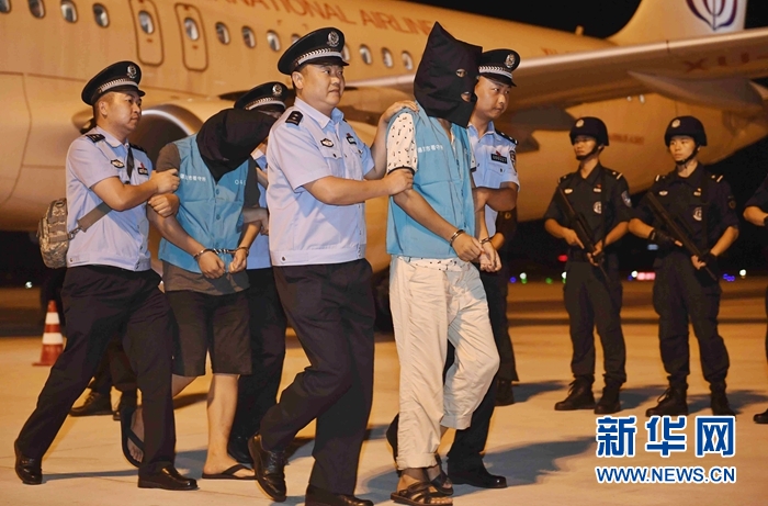 2017年8月24日,在成都雙流國際機(jī)場,122名跨國電信詐騙案件犯罪嫌疑人從柬埔寨被統(tǒng)一押解回國。新華社記者 吳光于 攝