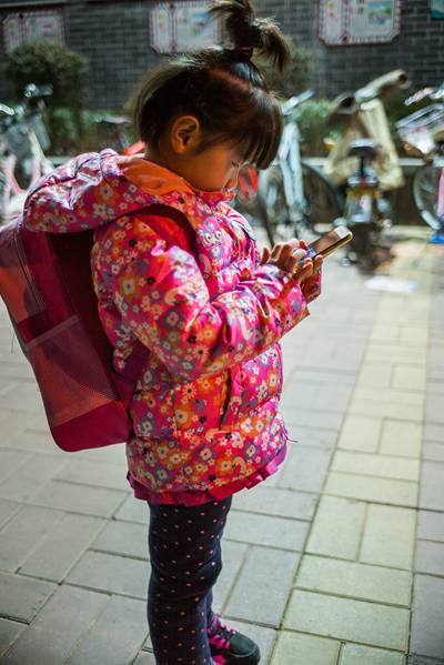 1月19日,在濟南實驗初中校門外,一位和姑姑來等表姐放學(xué)的小女孩,背著幼兒園的小書包,站在那里低頭聚精會神地玩著姑姑的手機。