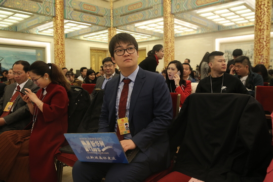 圖為2018年全國(guó)兩會(huì),王子暉在總理記者會(huì)現(xiàn)場(chǎng)采訪。