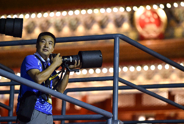 圖為2015年9月3日,羅曉光在天安門城樓前金水橋上的點位等候幾個小時后將進行的閱兵。