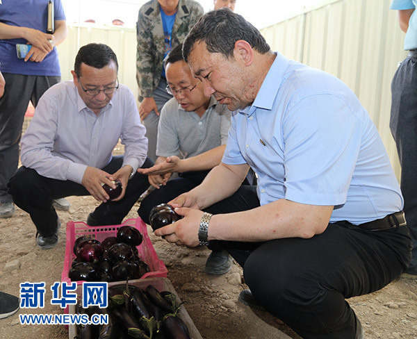 吾布力喀斯木(右)在檢查大棚蔬菜的質(zhì)量(資料照片)。新華社發(fā)