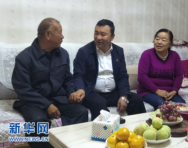 吾布力喀斯木(中)看望結(jié)親對(duì)象、老黨員周福年一家(10月17日攝)。新華社記者 孫少雄 攝