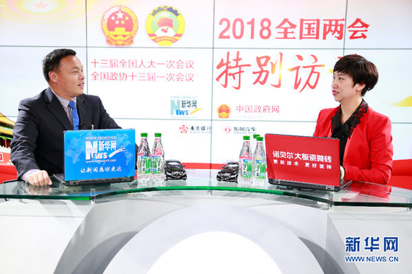圖為全國(guó)人大代表、河南省平頂山市寶豐縣大黃村黨支部書(shū)記馬豹子做客新華網(wǎng)2018全國(guó)兩會(huì)特別訪(fǎng)談 新華網(wǎng) 范作言 攝