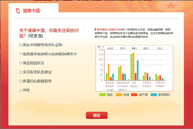 美好生活離不開健康,沒有全民健康,就沒有全面小康。在今年的兩會熱點調(diào)查中,健康中國引發(fā)網(wǎng)民普遍關(guān)注,排名靠前。