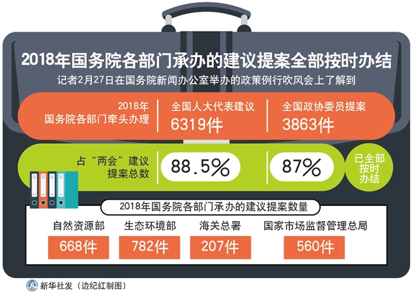 新華社北京2月27日電(胡璐、張涵)2018年,國務院各部門牽頭辦理全國人大代表建議6319件,全國政協(xié)委員提案3863件,分別占“兩會”建議提案總數(shù)的88.5%和87%,已全部按時辦結。