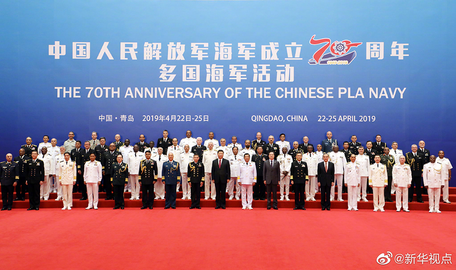 23日10時20分許,國家主席、中央軍委主席習近平在青島國際會議中心同應邀前來參加中國人民解放軍海軍成立70周年多國海軍活動的外方代表團團長集體合影留念。 ????