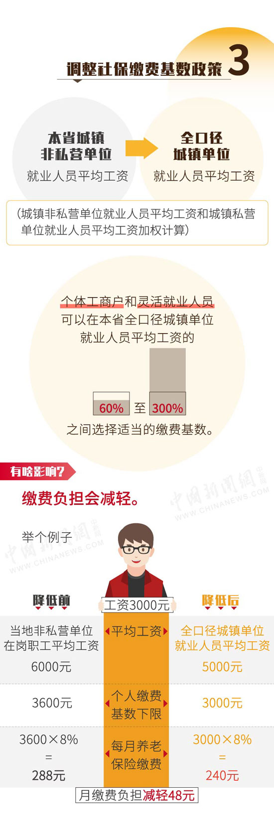 計(jì)算口徑調(diào)整之后,全口徑城鎮(zhèn)單位就業(yè)人員平均工資為5000元,則個(gè)人繳費(fèi)基數(shù)下限相應(yīng)降低到3000元,每月繳費(fèi)則降到240元,月繳費(fèi)負(fù)擔(dān)相應(yīng)減輕48元。