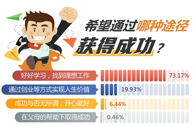 問卷調(diào)查中,93.1%的受訪大學(xué)生希望通過“好好學(xué)習(xí),找到理想工作”和“通過創(chuàng)業(yè)等方式實(shí)現(xiàn)人生價(jià)值”兩種途徑獲得成功。