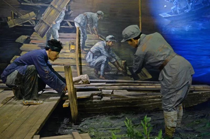 于都縣中央紅軍長(zhǎng)征出發(fā)紀(jì)念館中蘇區(qū)群眾鋪設(shè)浮橋場(chǎng)景。新華社記者 萬(wàn)象 攝