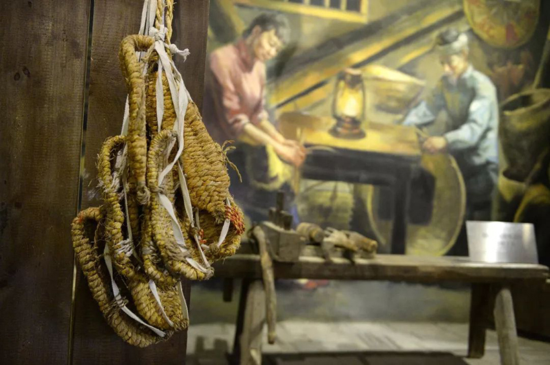在于都縣中央紅軍長(zhǎng)征出發(fā)紀(jì)念館內(nèi)展示的草鞋和制作草鞋的工具。新華社記者 萬(wàn)象 攝
