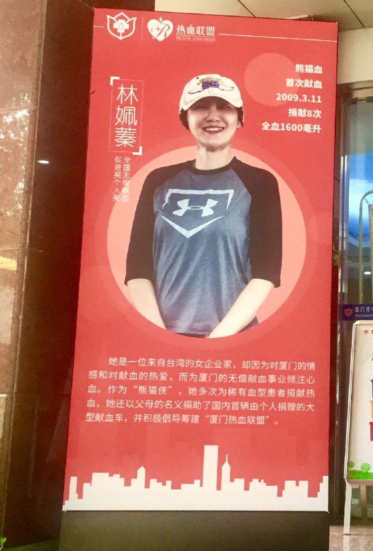 廈門市中心血站展板上宣介的是女臺(tái)商林姵蓁。她是Rh陰性血,這種血型因稀有而被稱為“熊貓血”。來自臺(tái)北的林姵蓁對(duì)無償獻(xiàn)血有一份執(zhí)著和擔(dān)當(dāng),這源于父親獻(xiàn)血幾十次的身教。她志愿成為無償為他人捐獻(xiàn)“熊貓血”的“熊貓俠”,在臺(tái)灣每次接到求助電話都會(huì)第一時(shí)間趕去獻(xiàn)血。