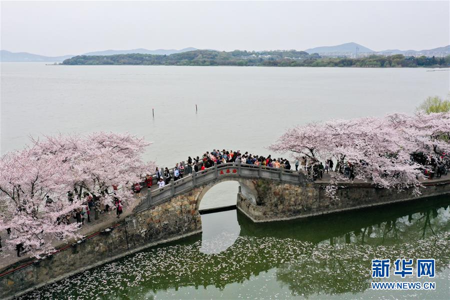 游客在江蘇無(wú)錫太湖黿頭渚風(fēng)景區(qū)內(nèi)賞櫻(4月2日無(wú)人機(jī)拍攝)。新華社記者 李博 攝