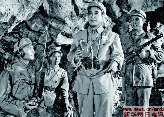 國產故事片《上甘嶺》鏡頭之一:堅守在上甘嶺的英雄們——張連長(右二)、通訊員楊德才(右一)、衛(wèi)生員王蘭(左二)。新華社發(fā)
