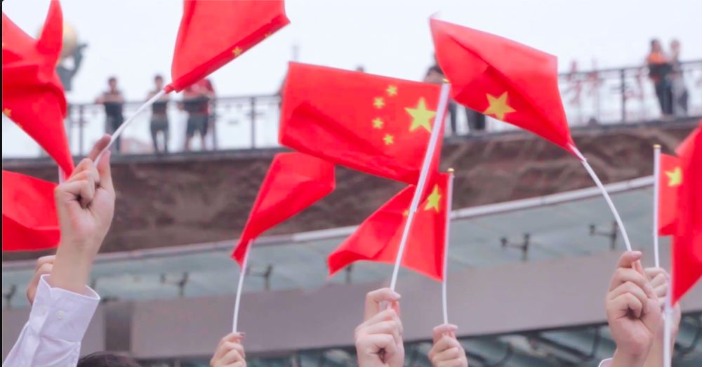 人們手中的國旗在空中飛舞