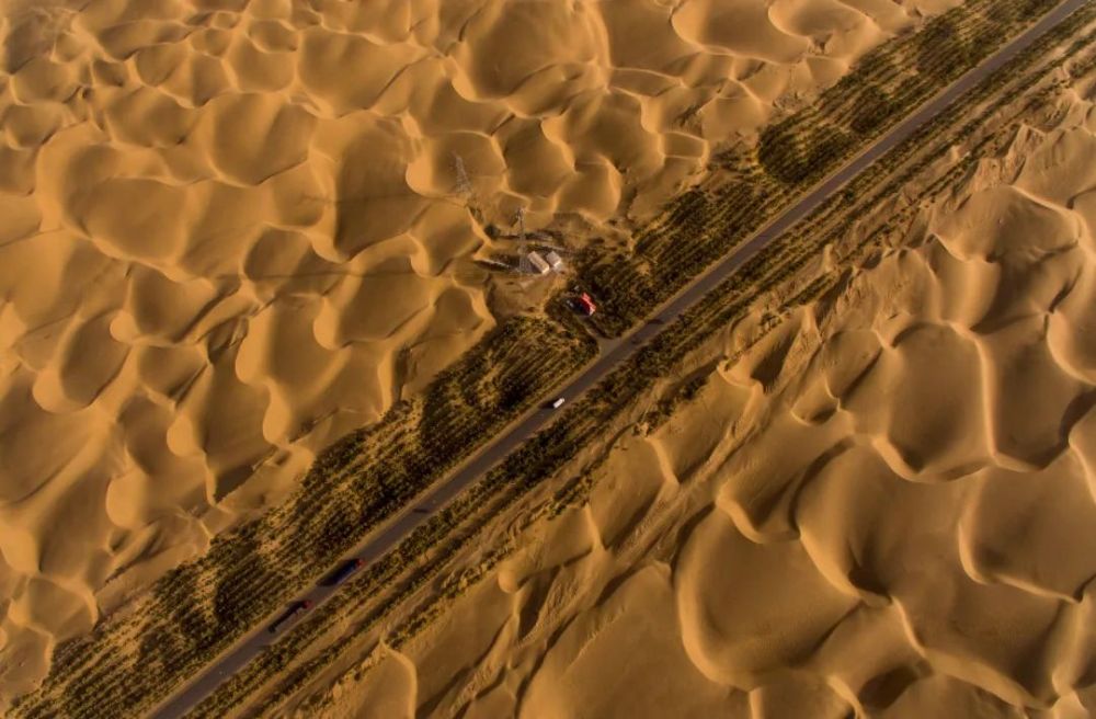 2016年9月27日,空中俯瞰新疆第一條沙漠公路——塔里木沙漠公路。(新華社記者江文耀 攝)