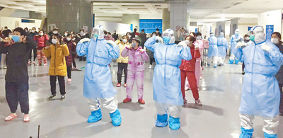 2月12日,武漢國際會展中心方艙醫(yī)院,醫(yī)護人員和患者一起跳舞。程少文攝(影像中國)