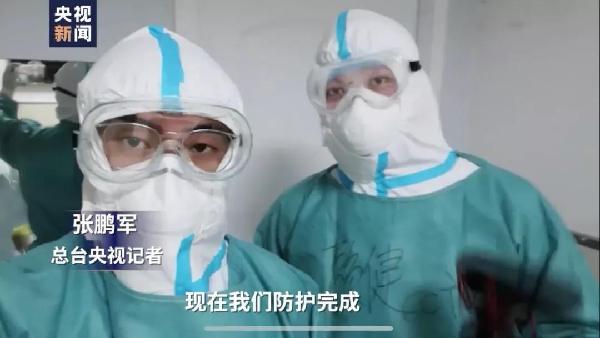 中央廣播電視總臺記者張鵬軍、賴健進(jìn)入武漢市漢口醫(yī)院隔離區(qū)采訪。