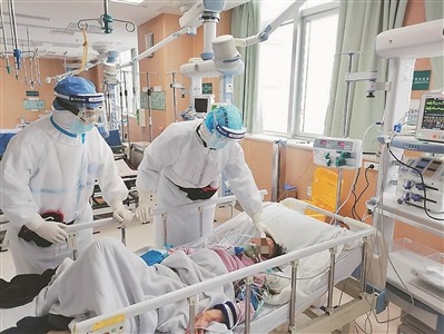 江蘇省人民醫(yī)院呼吸與危重癥醫(yī)學科副主任、主任醫(yī)師,武漢市第一醫(yī)院國家醫(yī)療隊聯(lián)合專家組組長齊栩(右一)和同事在武漢市第一醫(yī)院重癥監(jiān)護病區(qū)給危重癥患者進行檢查。