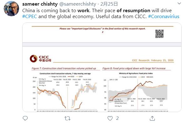 推特用戶sameer chishty說:中國(guó)正在復(fù)工復(fù)產(chǎn)。他們的這一步伐將驅(qū)動(dòng)全球經(jīng)濟(jì)增長(zhǎng)。