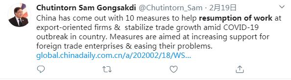 推特用戶Chutintorn Sam Gongsakdi說:在應(yīng)對(duì)新冠肺炎疫情期間,中國(guó)出臺(tái)了10項(xiàng)措施來幫助出口企業(yè)復(fù)工復(fù)產(chǎn),并推動(dòng)貿(mào)易的穩(wěn)定增長(zhǎng)。這些措施旨在加強(qiáng)對(duì)外貿(mào)企業(yè)的支持,并解決它們面臨的問題。