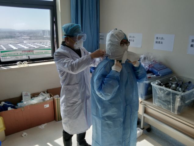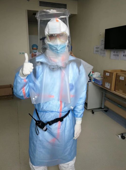 首先是防護(hù)裝備。進(jìn)隔離病房一般是三級(jí)防護(hù),除穿戴防護(hù)服、隔離衣、護(hù)目鏡、N95口罩、兩層手套,兩層腳套外,還要戴正壓防護(hù)頭套或一次性全面型防護(hù)頭套。此外,頭套還帶有新風(fēng)過(guò)濾系統(tǒng)。整套防護(hù)裝備,凌肯在老師的幫助下,花了半個(gè)小時(shí)才穿上。穿戴完畢,凌肯整個(gè)人都很難受。護(hù)目鏡起霧,頭套風(fēng)機(jī)發(fā)出巨大噪音,還有悶熱,整個(gè)人都變得遲鈍。