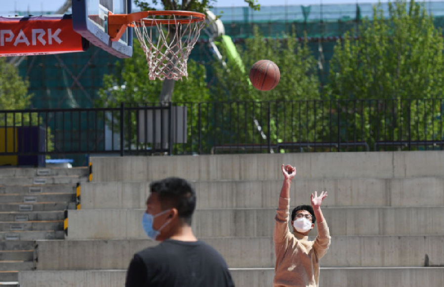 4月22日,市民通過實(shí)名預(yù)約場地,在北京市五棵松籃球公園室外球場打球 鞠煥宗/攝