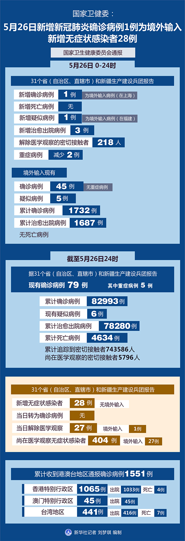 截至5月26日24時,據(jù)31個?。ㄗ灾螀^(qū)、直轄市)和新疆生產(chǎn)建設(shè)兵團報告,現(xiàn)有確診病例79例(其中重癥病例5例),累計治愈出院病例78280例,累計死亡病例4634例,累計報告確診病例82993例,現(xiàn)有疑似病例6例。累計追蹤到密切接觸者743586人,尚在醫(yī)學(xué)觀察的密切接觸者5796人。